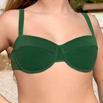El bikini Bimba Palm está confeccionado con tejido de poliamida reciclada ECONYL®. Compuesto por un top tipo balconette con aro, tirantes regulables y cierre de lazada en la espalda junto con braguita brasileña. Ambos en color verde oscuro mediterráneo y tejido con textura "atoallada". Posibilidad de introducir copas.