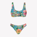El bikini Mani Aloa está confeccionado con tejido de poliamida reciclada 100% ECOWAVE® y estampación digital sostenible ZEROWATER. Está compuesto por braga brasileña y un top estilo deportivo de tiras anchas con sujeción óptima para pecho y con posibilidad de introducir copas. En un print original de Circu lleno de color con motivos florales en textura de piqué y acabado lúrex.