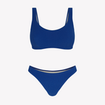 El bikini Mani Zafiro está confeccionado con tejido de poliamida reciclada ECONYL®. Está compuesto por braga brasileña y un top estilo deportivo de tiras anchas con sujeción optima para pecho y posibilidad de introducir copas. En azul mediterráneo y tejido con textura de "atoallada".