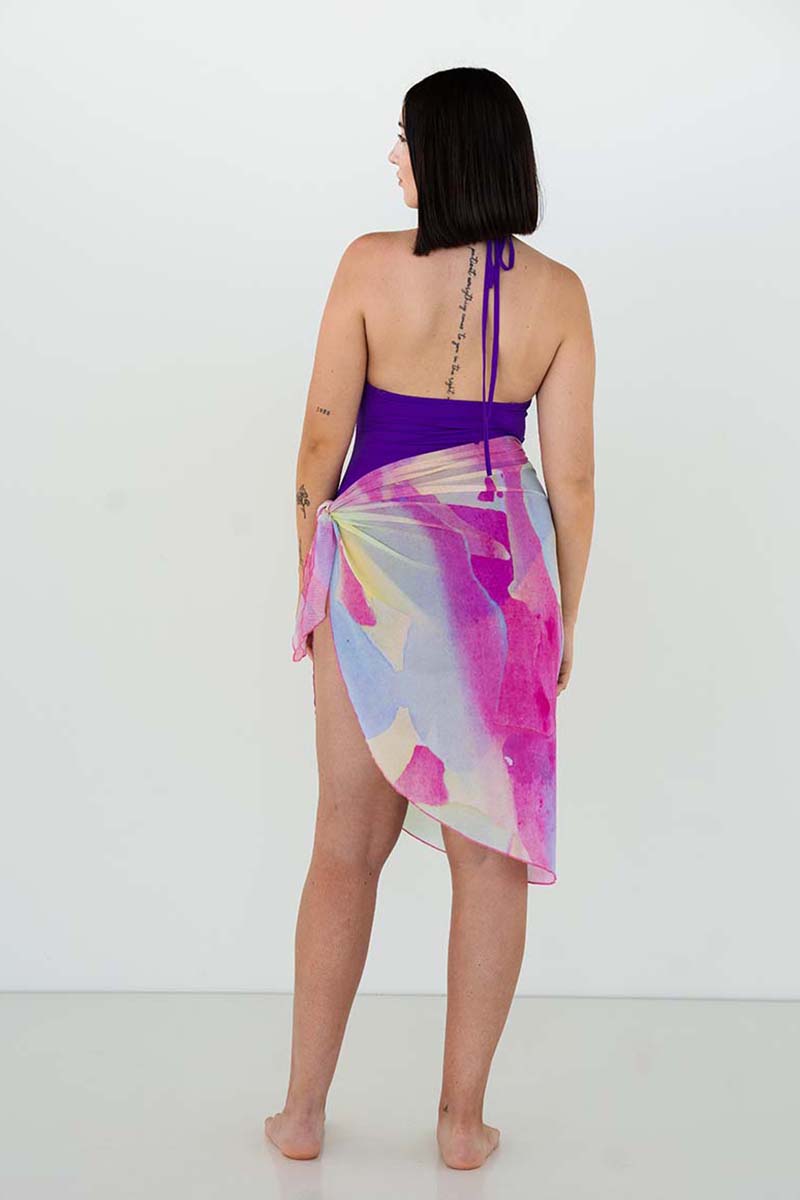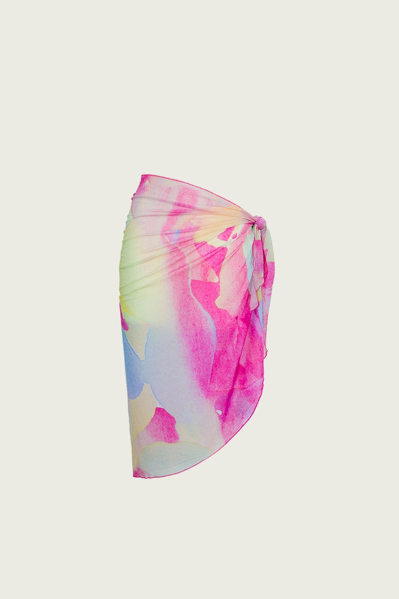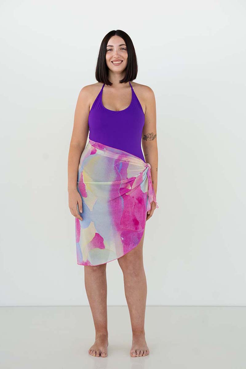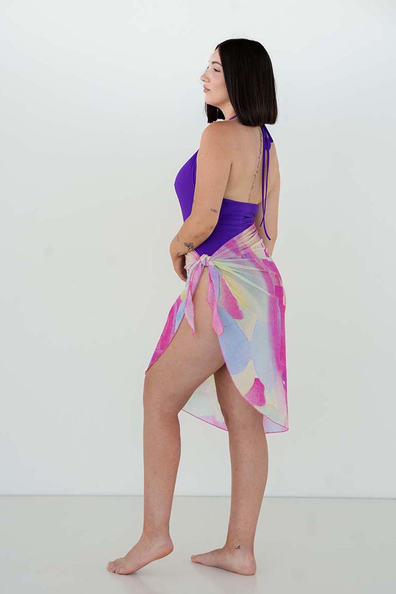 El pareo mango garatusa está confeccionado con tejido transparente de lycra de alta calidad y producción sostenible. Es un pareo largo, abierto, de acabado ovalado, y lazada en ambos extremos para ajustar al gusto. El estampado es exclusivo y está inspirado en la diversión y los colores mediterráneos del atardecer.