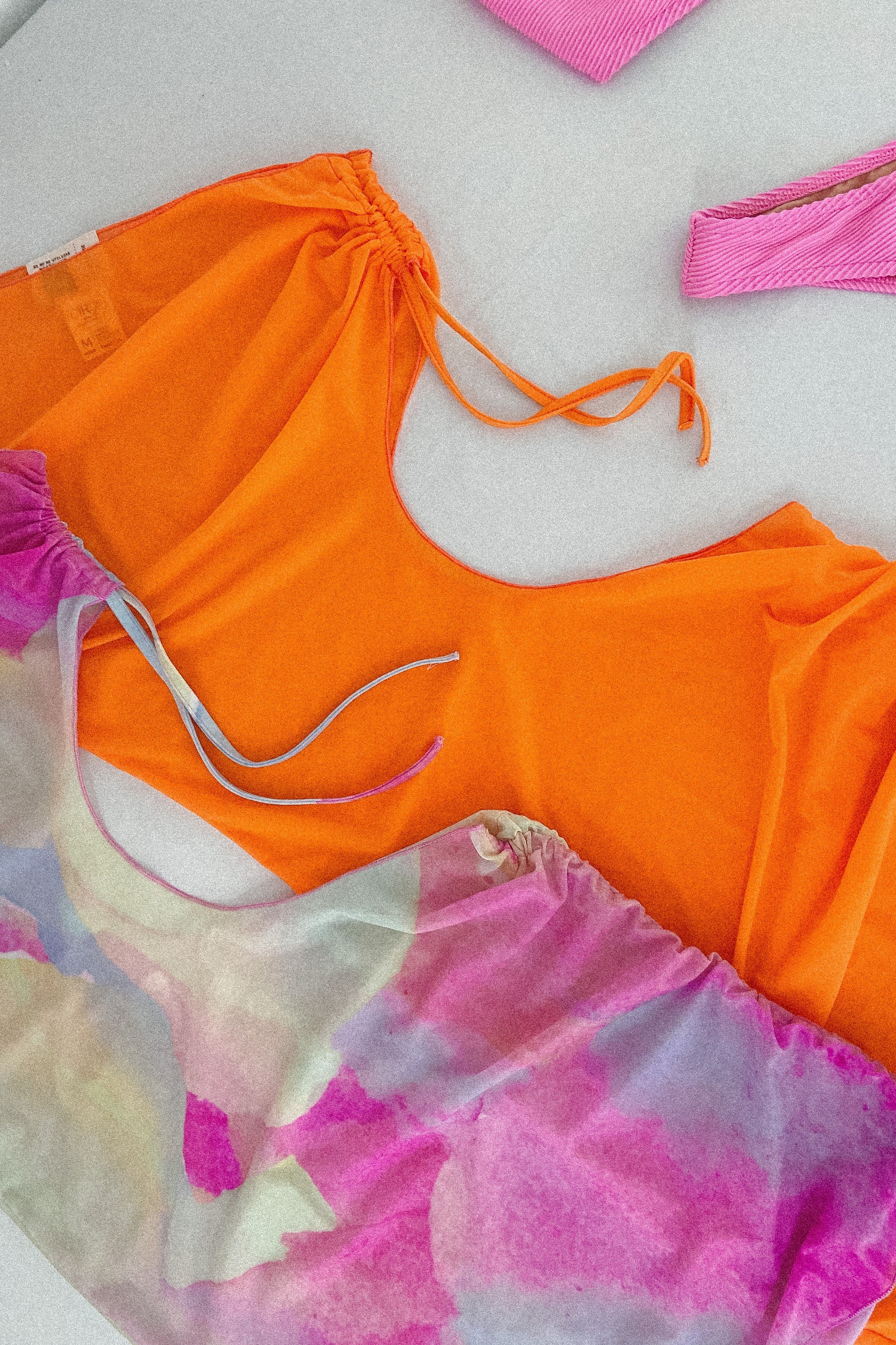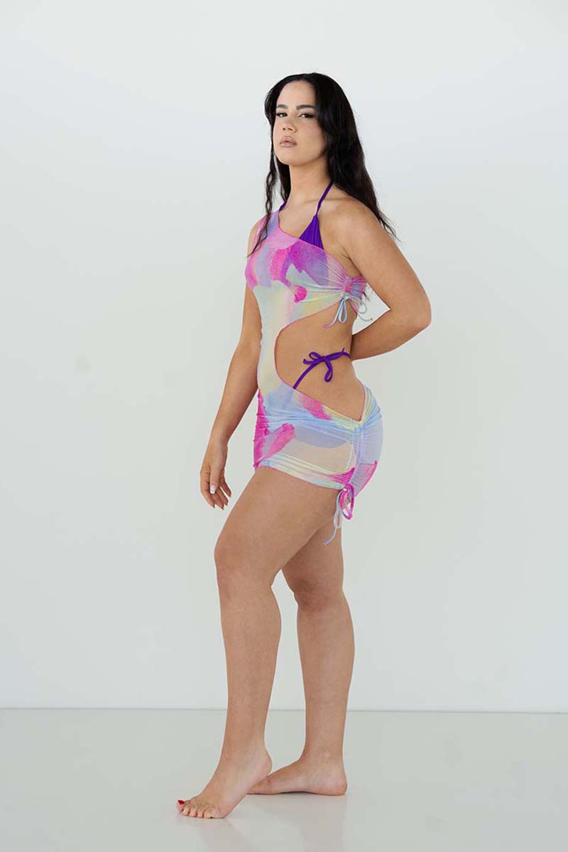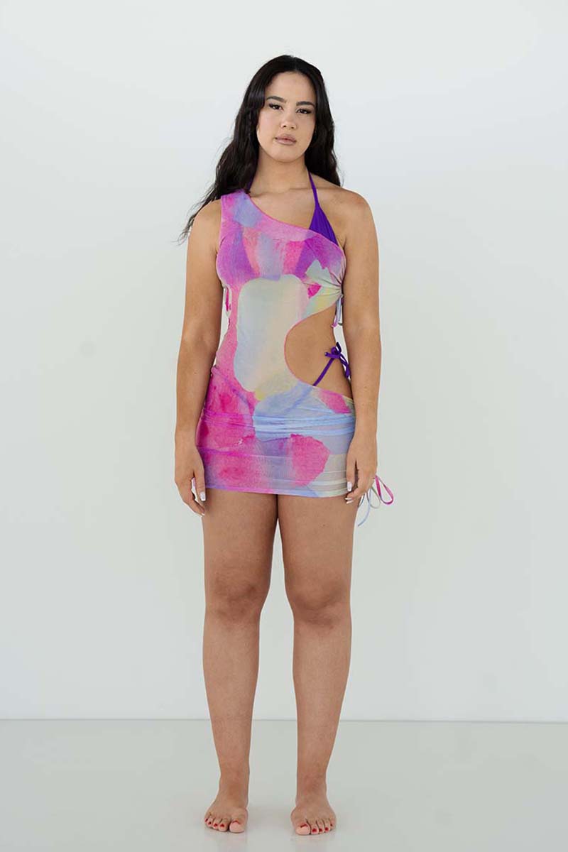 El vestido nut garatusa está confeccionado con tejido transparente de lycra de alta calidad y producción sostenible. Consta de fruncidos en el lado izquierdo tanto en la parte del pecho como en la cadera, con una apertura ovalada en el abdomen, la cual se modifica al gusto frunciendo desde la parte superior o inferior con las tiras. Su estampado es exclusivo al estilo tye-die está inspirado en la diversión y los colores mediterráneos del atardecer. Crea tus looks más divertidos y originales con este diseño único.