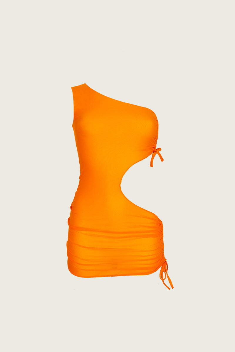El vestido nut orange está confeccionado con tejido transparente de lycra de alta calidad y producción sostenible. Consta de fruncidos en el lado izquierdo tanto en la parte del pecho como en la cadera, con una apertura ovalada en el abdomen, la cual se modifica al gusto frunciendo desde la parte superior o inferior con las tiras. En color mandarina vibrante que te hará destacar en todos tus planes de verano.