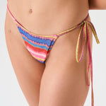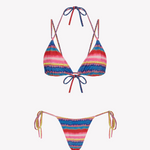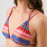 Der Lise Samba Bikini besteht aus recyceltem ECOWAVE®-Polyamidgewebe und nachhaltigem ZEROWATER-Digitaldruck. Bestehend aus einem gerafften Dreiecksoberteil mit mehreren Positionen, das im Nacken oder an den Schultern gebunden werden kann, und einem Tanga-Slip mit Schleifen. Hergestellt mit einem originalen Circu-Druck mit bunten horizontalen Streifen und einem Lurex-Finish.
