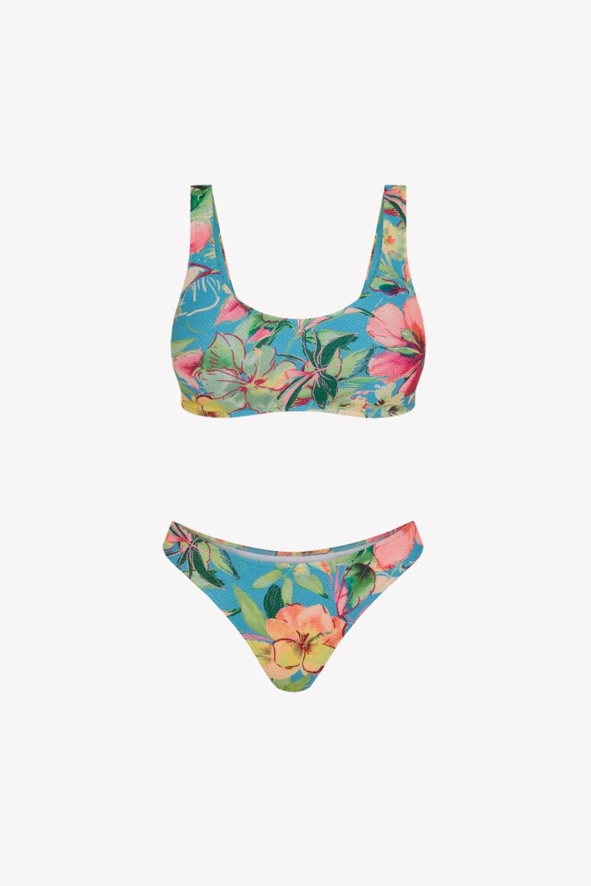 Der Mani Aloa Bikini besteht aus 100 % recyceltem ECOWAVE®-Polyamidgewebe und nachhaltigem ZEROWATER-Digitaldruck. Es besteht aus einem Brazilian Slip und einem Top im Sport-Stil mit breiten Trägern, die der Brust optimalen Halt geben und die Möglichkeit bieten, Cups einzusetzen. In einem originellen, farbenfrohen Circu-Druck mit floralen Motiven in Piqué-Textur und Lurex-Finish.