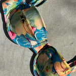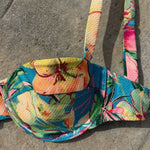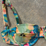 Der High-Waist-Bikini Bimba Aloa besteht aus recyceltem Polyamidgewebe ECOWAVE® und nachhaltigem Digitaldruck ZEROWATER. Es besteht aus einem Balconette-Oberteil mit Bügeln, verstellbaren Trägern und einem Bindeverschluss auf der Rückseite sowie einem Höschen mit hoher Taille, das die Figur betont und mehr Schutz bietet. Beide im farbenfrohen Original-Circu-Print mit floralen Motiven in Piqué-Textur und Lurex-Finish.
