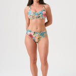 Der Mani Aloa Bimba High Bikini besteht aus recyceltem ECOWAVE®-Polyamidgewebe. Es besteht aus einem sportlichen Top mit breiten Trägern, die der Brust optimalen Halt geben und die Möglichkeit bieten, Cups einzusetzen, und einem hoch taillierten Höschen, das die Figur betont und gleichzeitig mehr Bedeckung bietet. Beide im farbenfrohen Original-Circu-Print mit floralen Motiven in Piqué-Textur und Lurex-Finish.