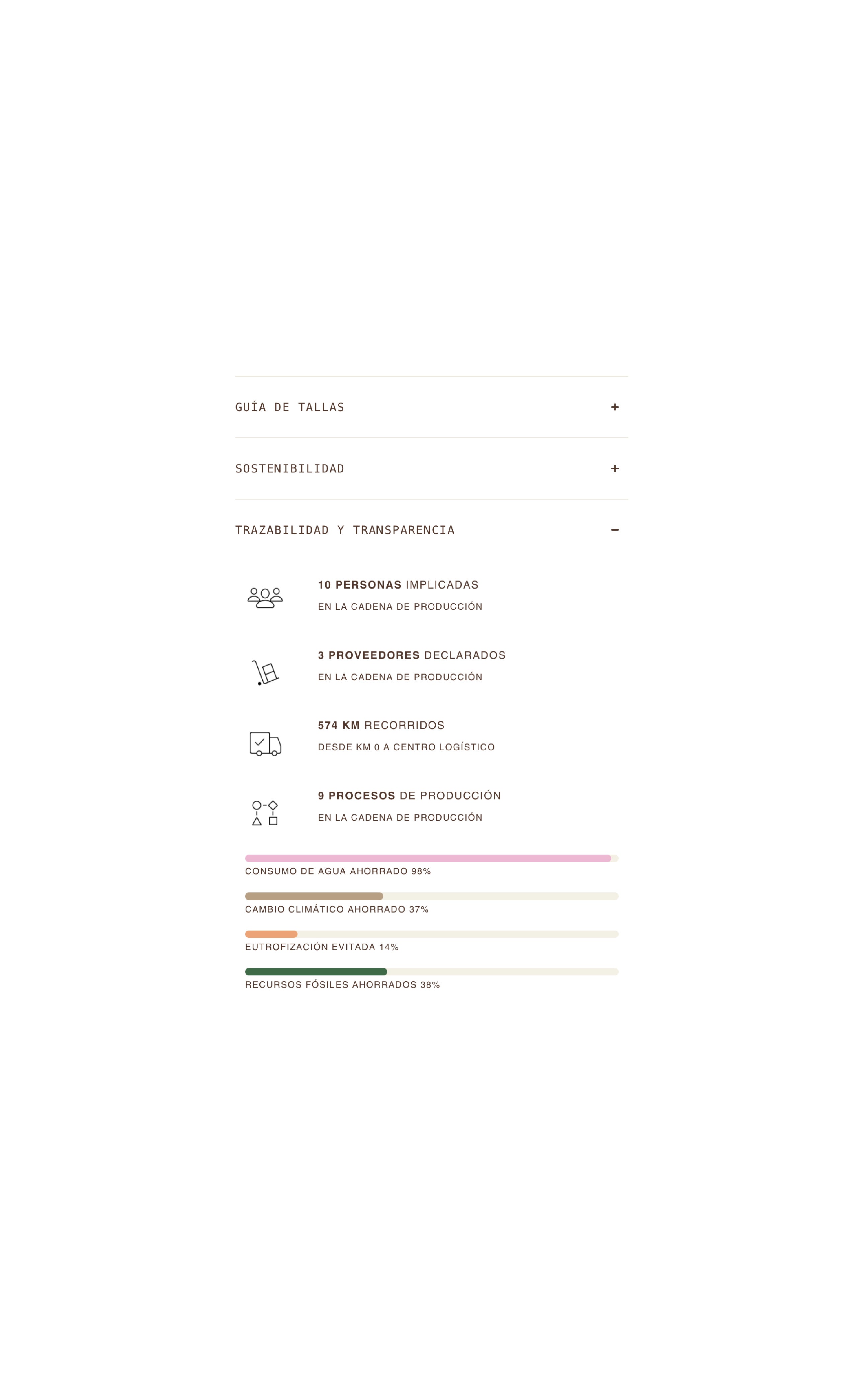 - Transparencia y trazabilidad en el proceso de producción de prendas. A la hora de comprar, encontrarás en cada una de las prendas sus datos correspondientes sobre sostenibilidad, ahorro del cambio climático y personas que han formado la cadena de valor.