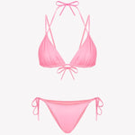 Bikini sostenible Lise Gara Pink. Top triangular fruncido multiposición y braga normal con lazada. Tejido reciclado ECOWAVE® en rosa chicle con efecto mojado. Hecho en España de forma ética.