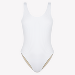 The Indo Merengue swimsuit is made from ECONYL® recycled lycra fabric. With a round neckline and open round back and medium coverage, in ribbed fabric and white. This swimsuit is a summer essential.