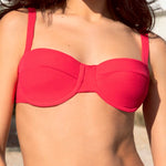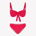 Der Bimba Berry Bikini besteht aus recyceltem ECONYL®-Polyamidgewebe. Mit einem Balconette-Oberteil mit Bügeln, verstellbaren Trägern und einem Bindeverschluss auf der Rückseite sowie einem klassisch geschnittenen Slip, der Komfort und eine schmeichelhafte Passform bietet. Beide in leuchtendem Kirschrot und Stoff mit einer originellen „Handtuch“-Textur.