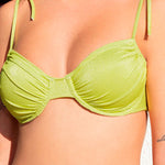 Der Gara Maca Lima Bikini besteht aus recyceltem ECOWAVE®-Polyamidgewebe. Bestehend aus einem gerafften Oberteil mit Bügel und verstellbaren Bindebändern und einem String-Slip. Hergestellt in einer frischen und fröhlichen Limettenfarbe voller Glanz dank der Lurex-Beschichtung.