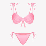 Der Gara Pink Bikini besteht aus recyceltem Polyamidgewebe Ecoyarn von ECOWAVE®. Bestehend aus einem gerafften Top mit Bügel und verstellbaren Bindebändern und einem normalen Slip mit Bindeband. Hergestellt in Kaugummirosa mit „nassem“ Finish. Öffnung zum Einsetzen von Cups vorhanden.
