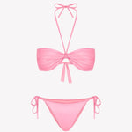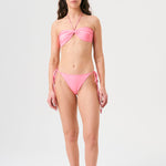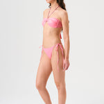 Der Maca Gara Pink Bikini besteht aus recyceltem ECOWAVE®-Polyamidgewebe. Bestehend aus einem gerafften Bandeau-Top mit einem verstellbaren Träger, der um den Hals gebunden oder abgenommen werden kann, und einem normalen Höschen mit Bändern. Hergestellt in Kaugummirosa mit „nassem“ Finish. Öffnung zum Einsetzen von Cups vorhanden.