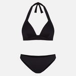The Bikini Milos Black is made with recycled ECONYL® polyamide fabric, this set is composed of a medium coverage panties with a high shot and a triangle bra with interchangeable loop and built -in glasses. Both in black color and grooved, soft and elastic fabric.