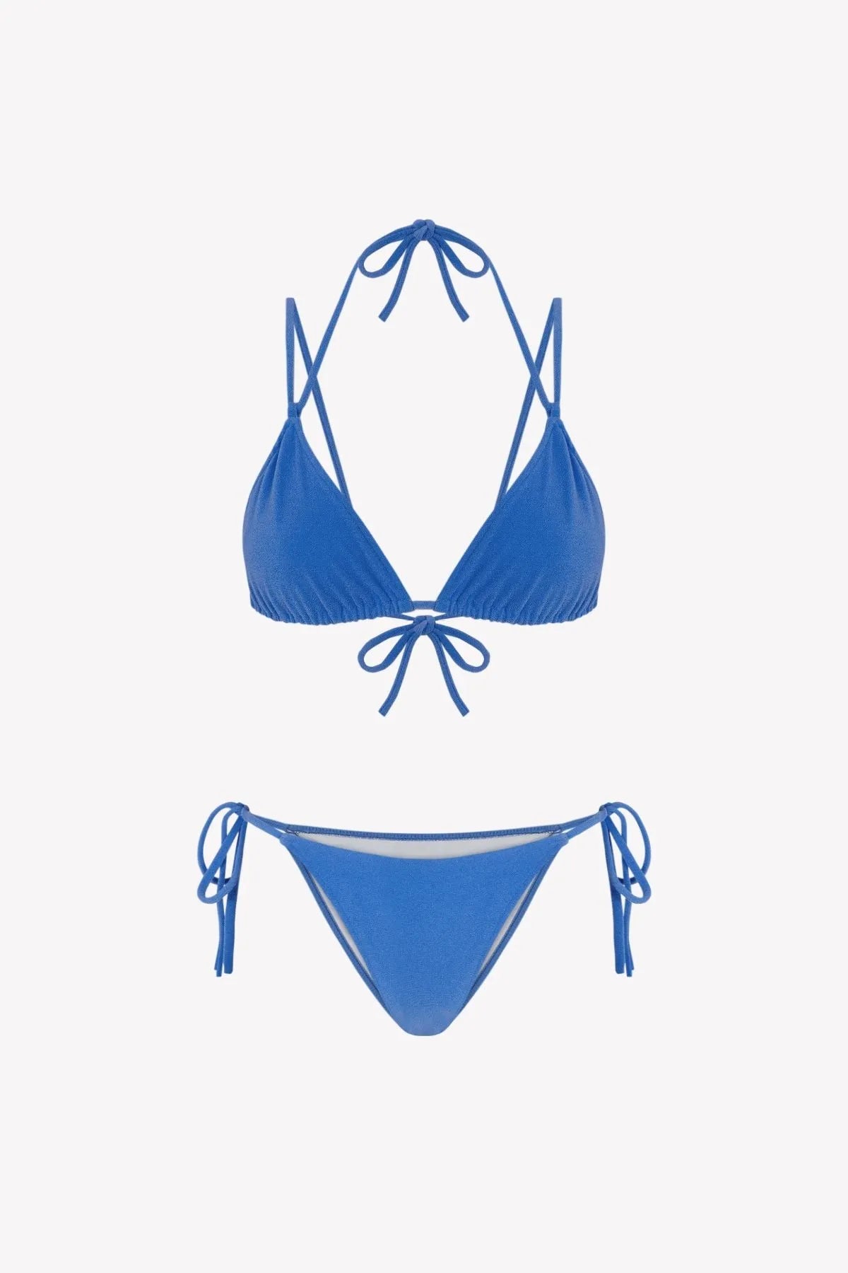 El bikini Lise Gara Positano está realizado en tejido de poliamida reciclada ECONYL®. Compuesto por top triangular fruncido multiposición con posibilidad de anudar al cuello u hombros y braga normal con lazada. Confeccionado en un inspirador color azul de bonitas aguas cristalinas, con tejido de textura "atoallada".