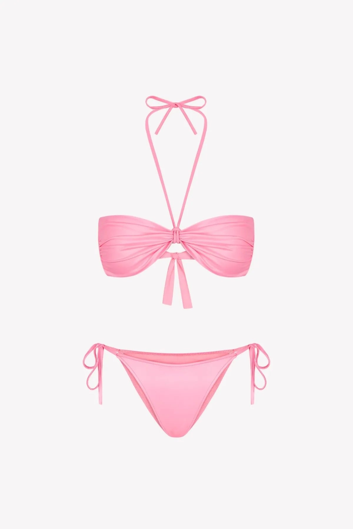 El bikini Maca Gara Pink está realizado en tejido de poliamida reciclada ECOWAVE®. Compuesto por top bandeau fruncido con cinta multiposición con posibilidad de anudar al cuello o quitarla y braga normal con lazadas. Confeccionado en un color rosa chicle con acabado "mojado". Disponible abertura para introducir copas.