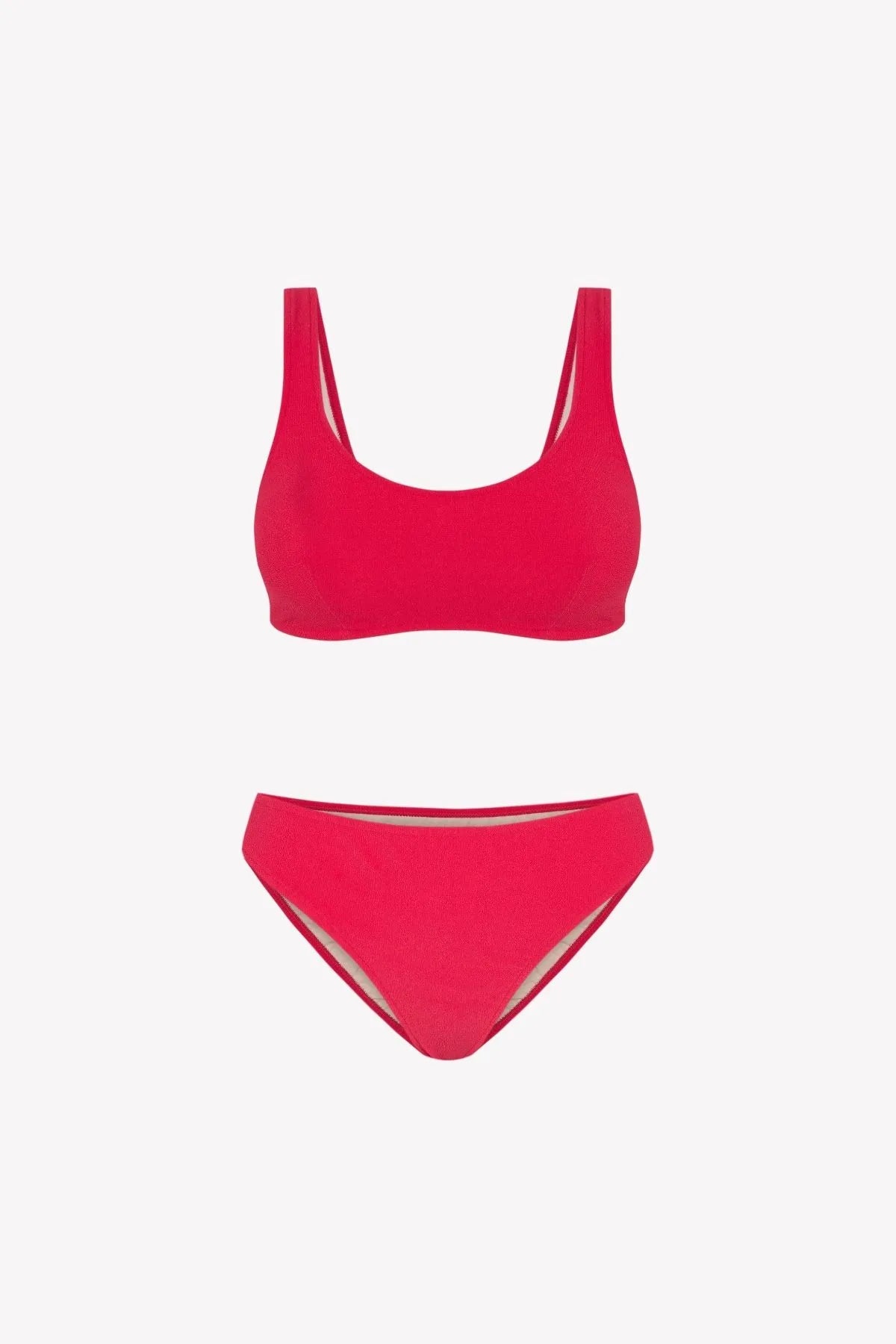 El bikini Mani Bimba Berry high está confeccionado con tejido de poliamida reciclada ECONYL®. Está compuesto por un top de estilo deportivo con tirantes anchos para máxima sujeción y por braguita de tiro alto que estiliza la figura ofreciendo mayor cobertura. Ambos en color rojo cereza vibrante y tejido con original textura "atoallada".
