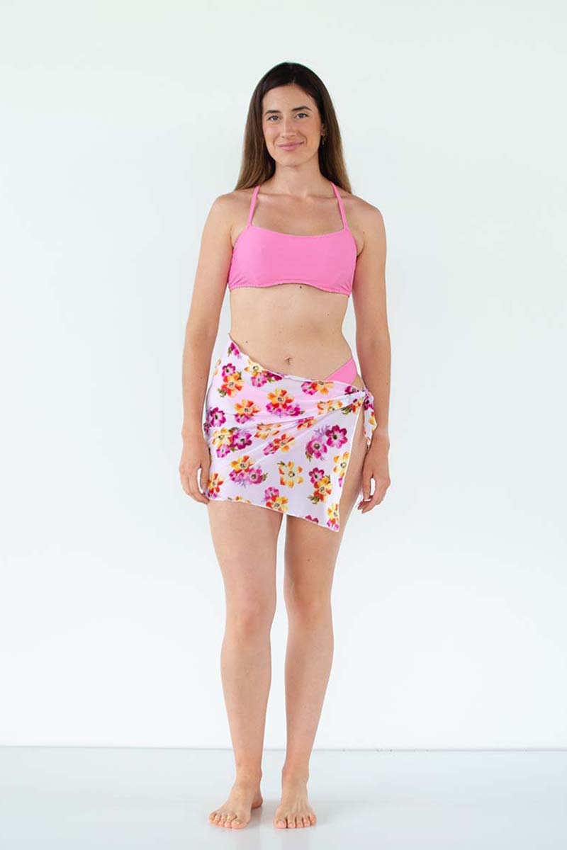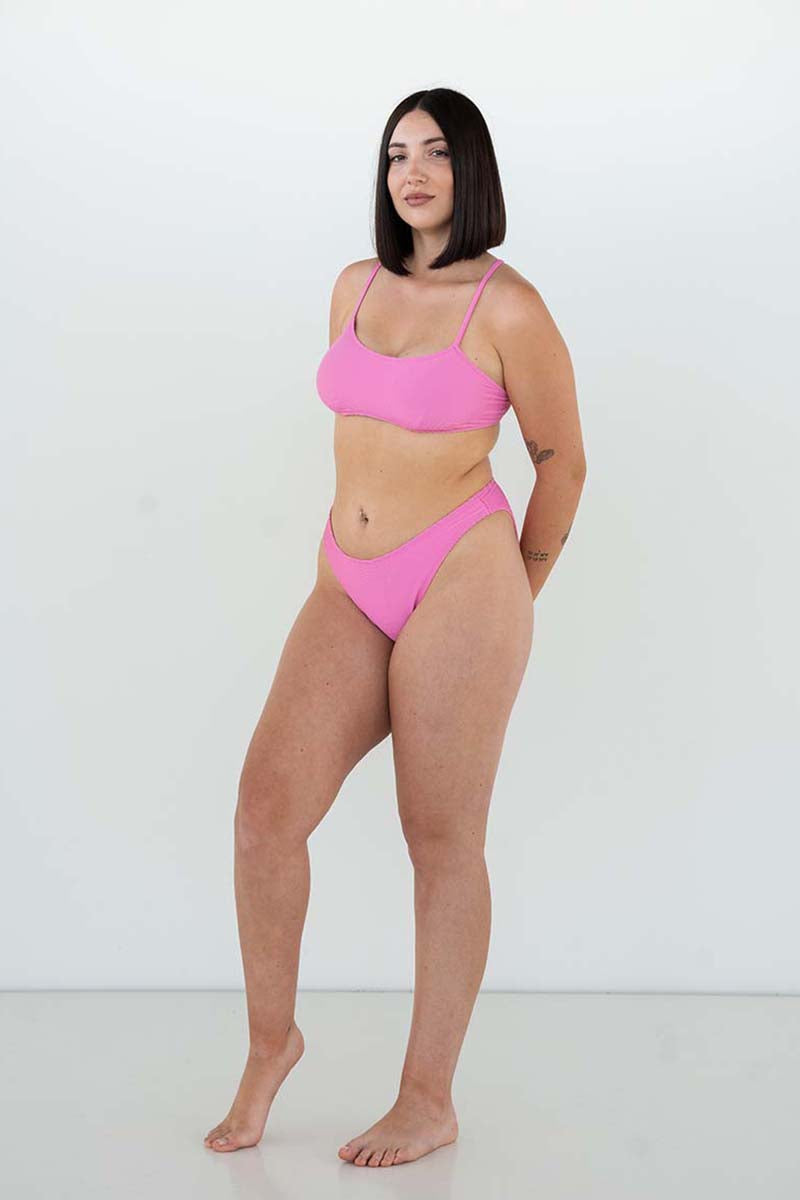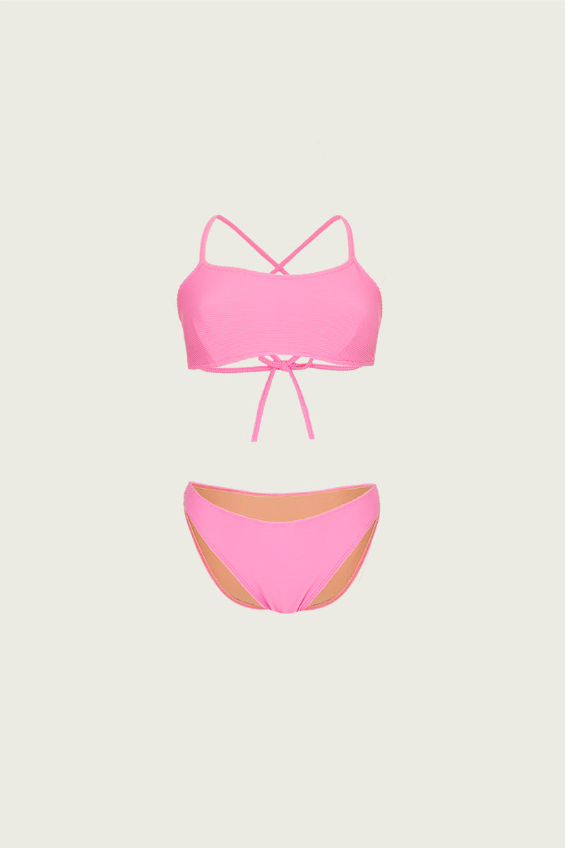 The Mamba Pink bikini is made of recycled ECONYL® polyamide fabric. Bikini set with great coverage and rectangular top with laced on the multiple back to adjust and exchange to taste and achieve the desired subjection. Both in acanalad texture fabric and a beautiful Petunia pink tone.