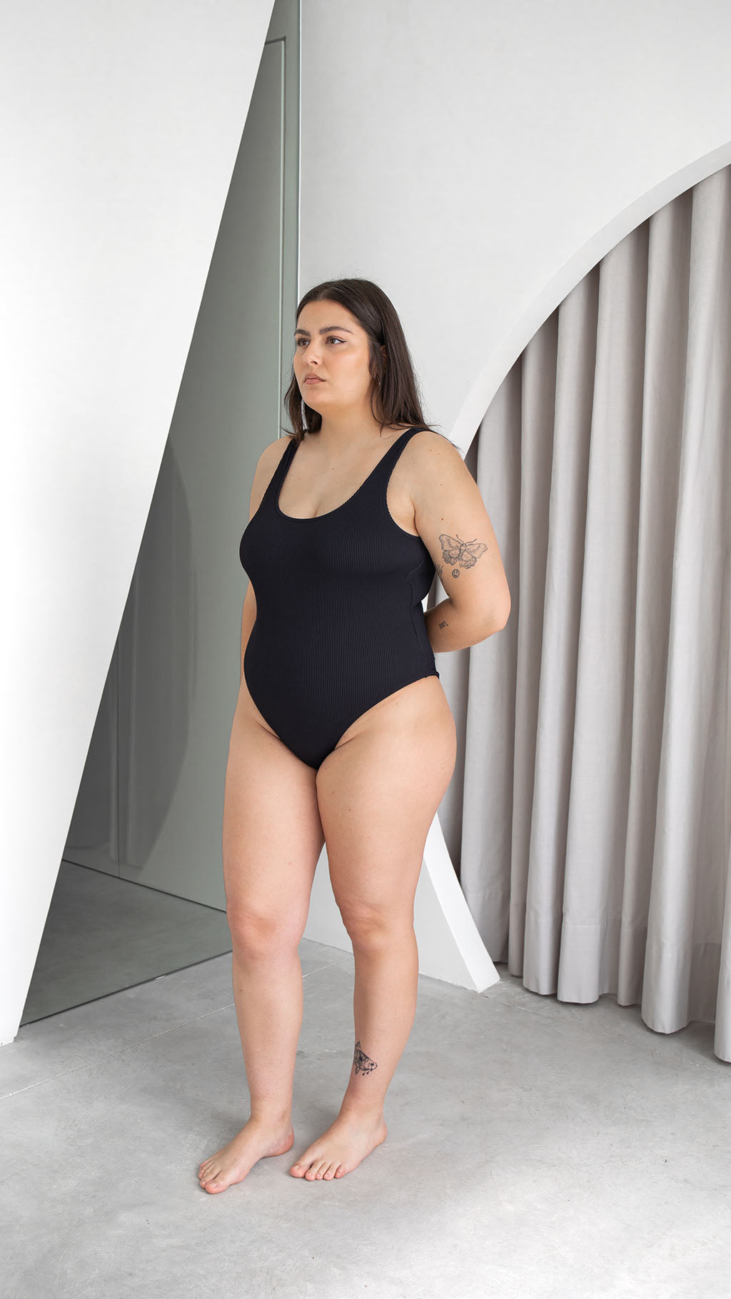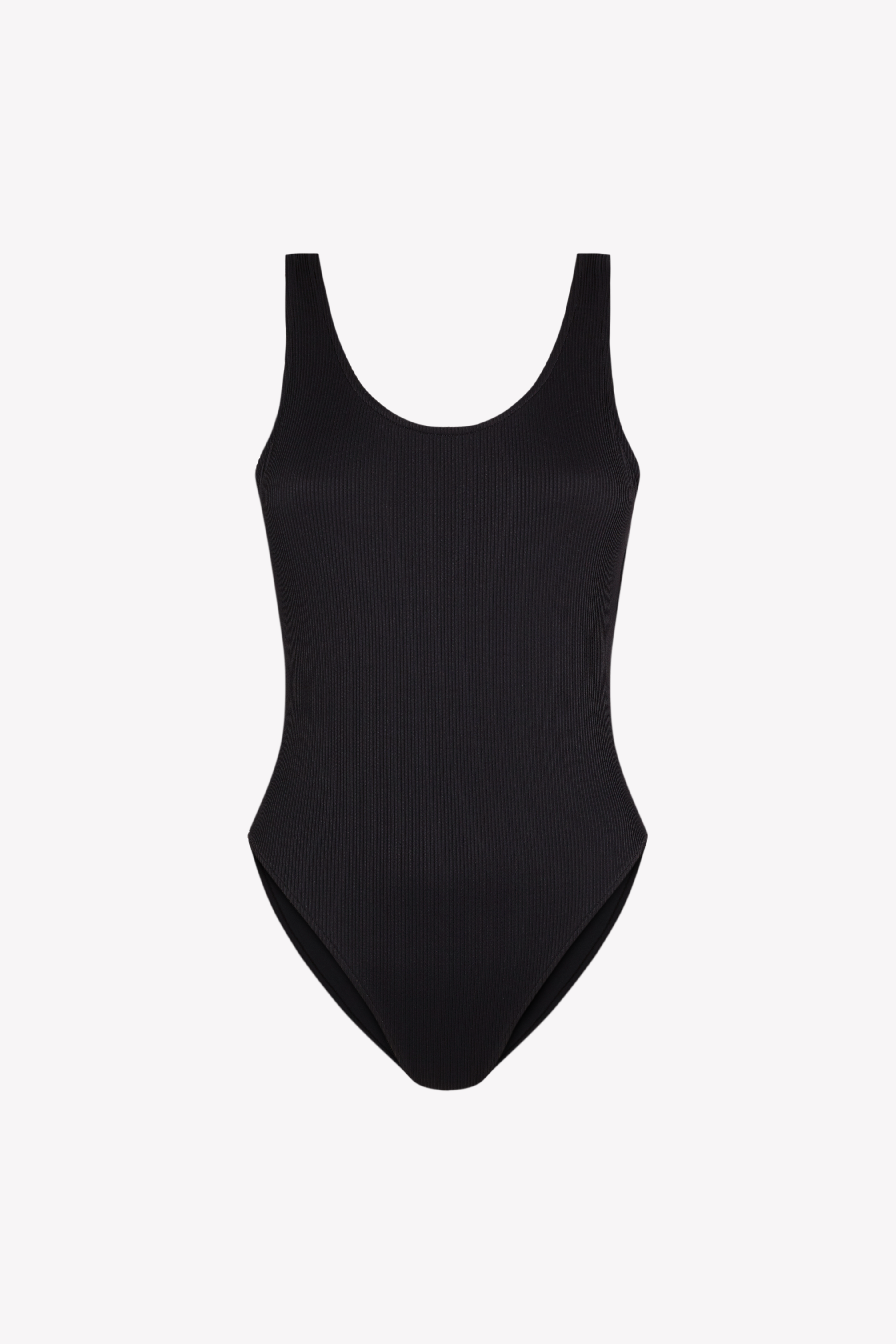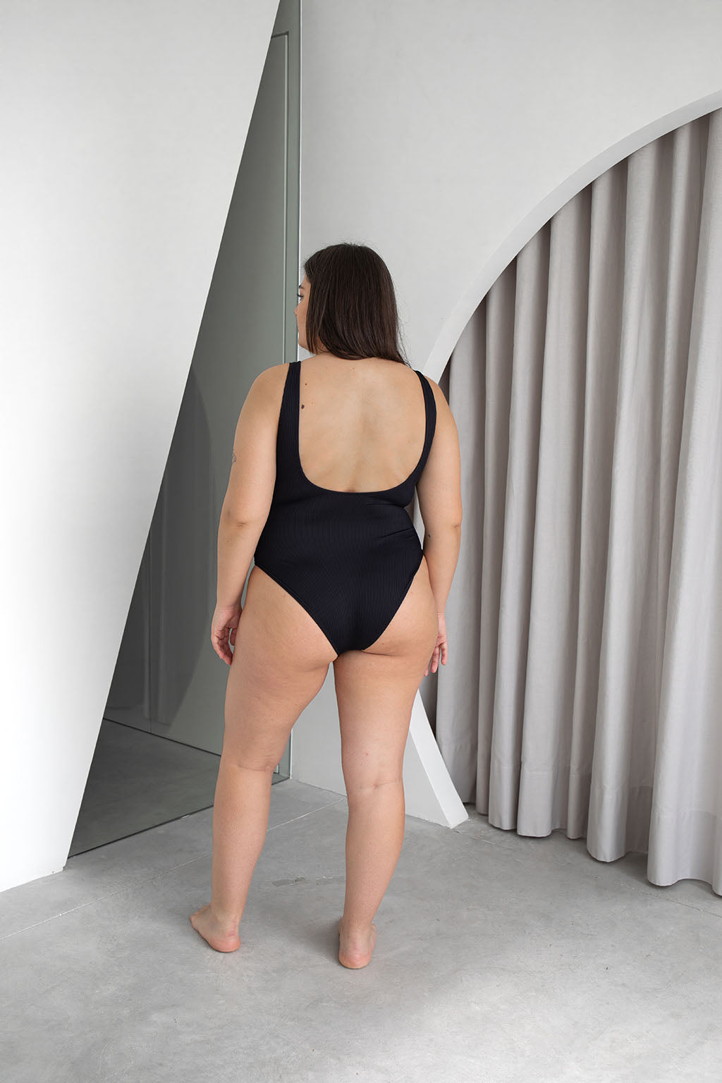 The indo black swimsuit is made from ECONYL® recycled lycra fabric. Featuring a round neckline and open round back and medium coverage, in ribbed fabric and black. This swimsuit is a summer essential.