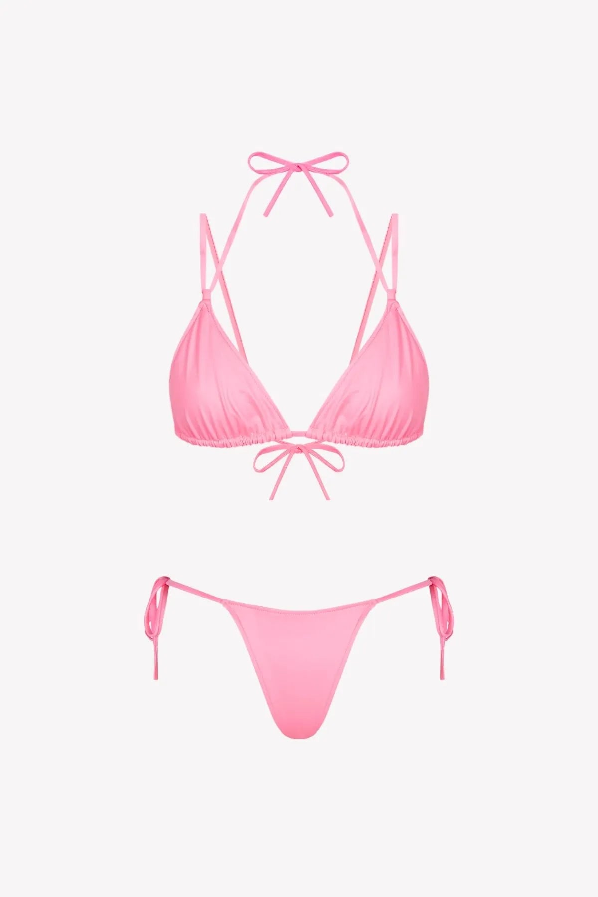 El bikini Lise Gara Pink está realizado en tejido de poliamida reciclada ECOWAVE®. Compuesto por top triangular fruncido multiposición con posibilidad de anudar al cuello u hombros y braga tanga con lazada. Confeccionado en un color rosa chicle con acabado "mojado". Disponible abertura para introducir copas.