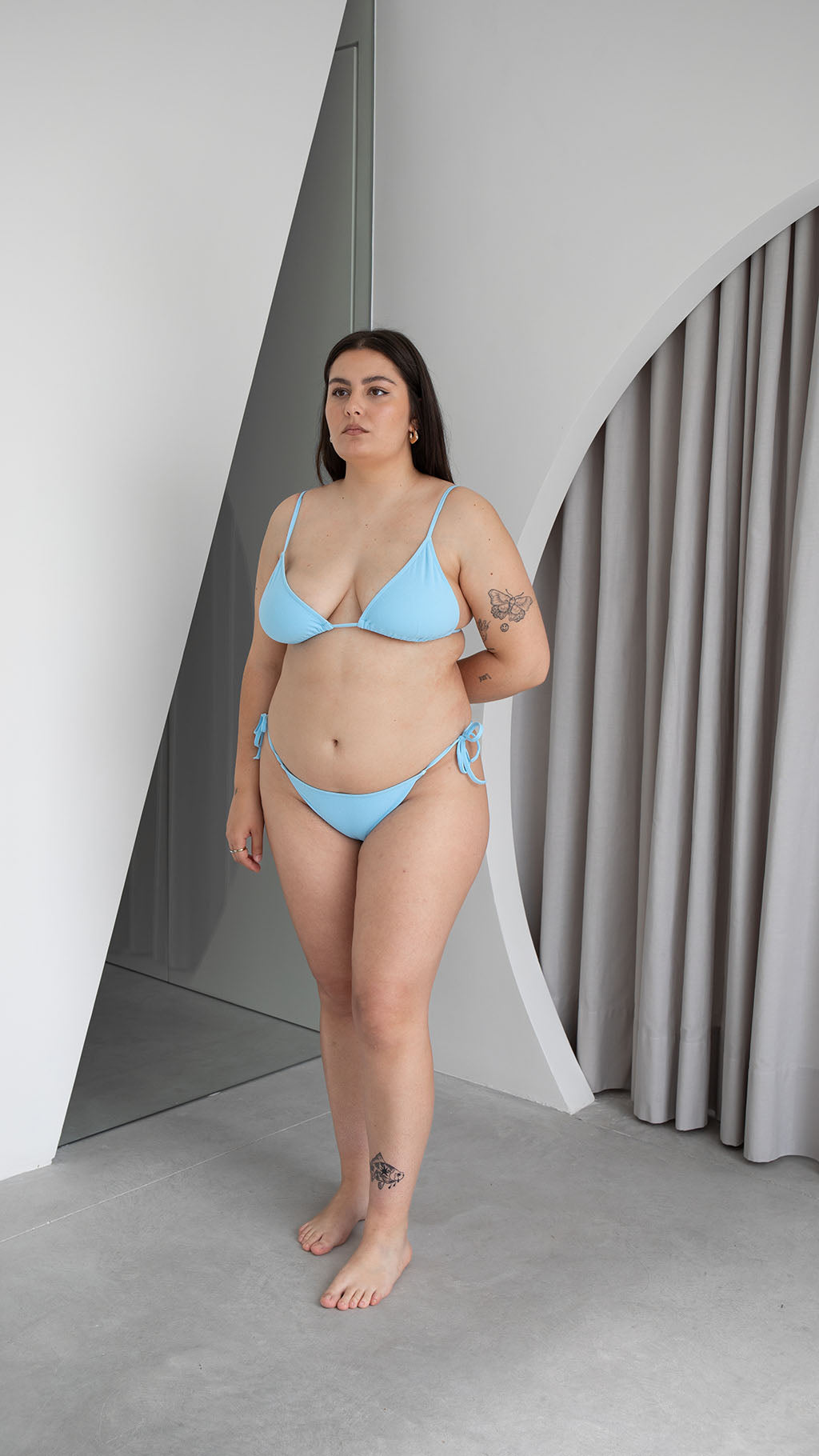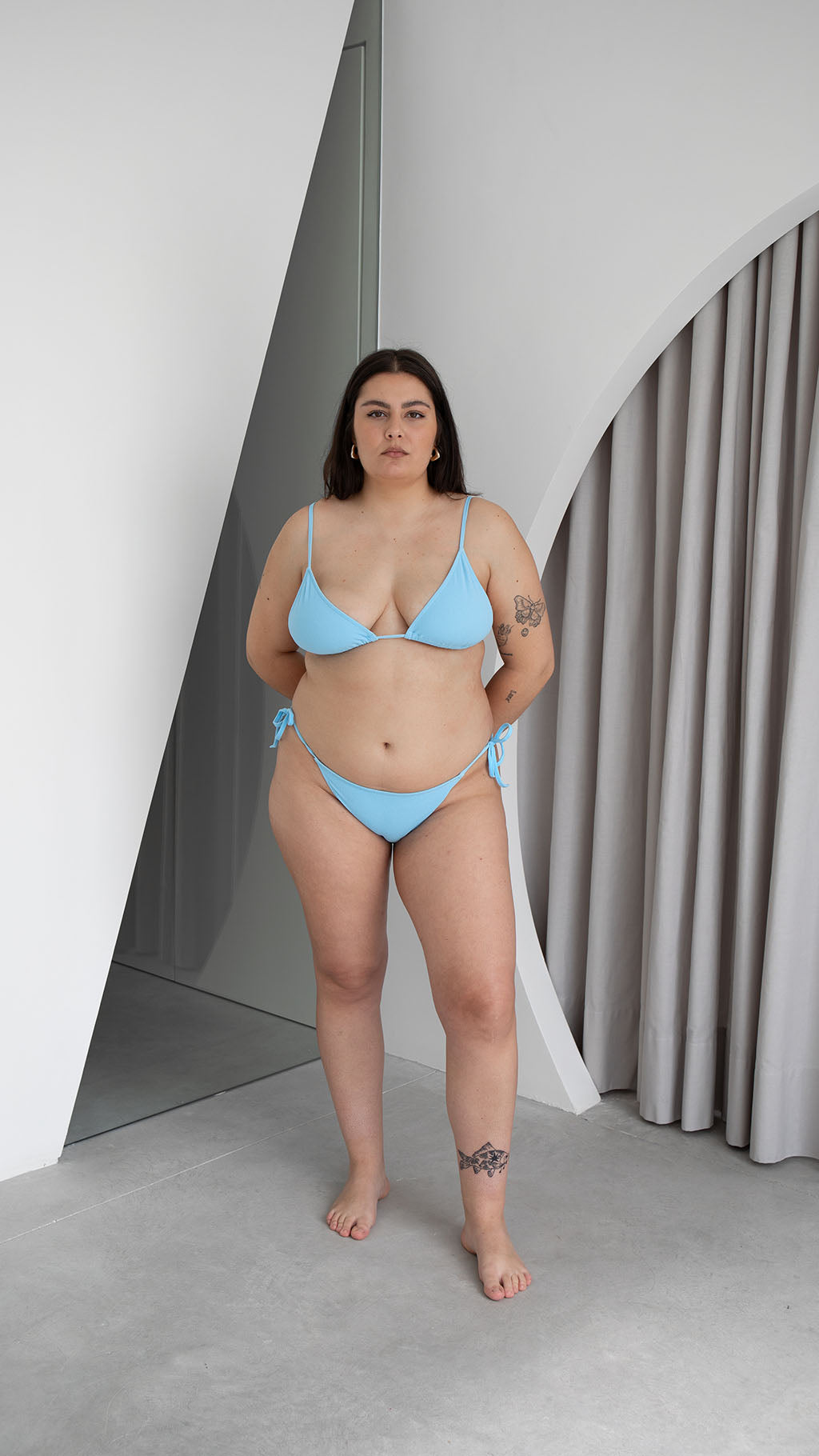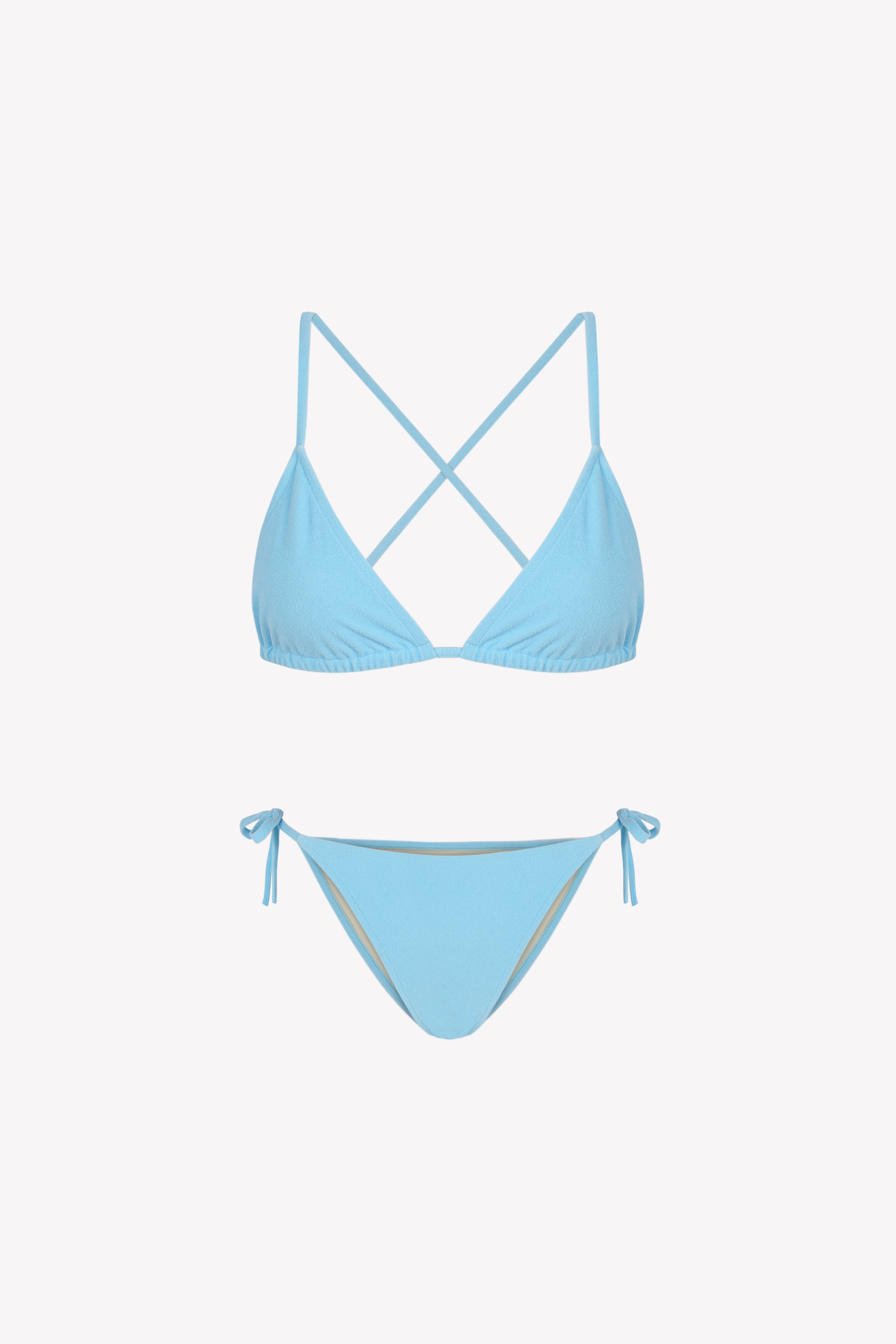 The Inca Baby bikini is made with recycled Polyamide tissue ECONYL®. Composed of adjustable triangular Top set and medium coverage panty with multiple adjustable strips. Made of sky blue and fabric with towel texture.