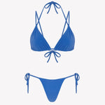 El bikini Lise Positano está realizado en tejido de poliamida reciclada ECONYL®. Compuesto por top triangular fruncido multiposición con posibilidad de anudar al cuello u hombros y braga tanga con lazada. Confeccionado en un inspirador color azul de bonitas aguas cristalinas, con tejido de textura "atoallada".