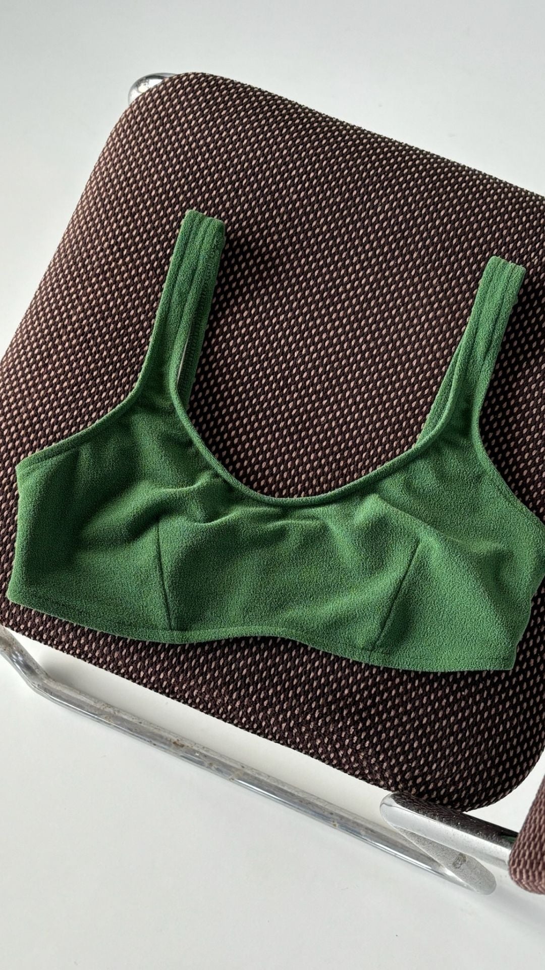 El bikini Mani Bimba Palm High está confeccionado con tejido de poliamida reciclada 100% ECONYL®. Está compuesto por un top estilo deportivo de tiras anchas con sujeción óptima para pecho y con posibilidad de introducir copas y por braguita de tiro alto que estiliza la figura ofreciendo mayor cobertura. Ambos en color verde oscuro mediterráneo y tejido con textura "atoallada".