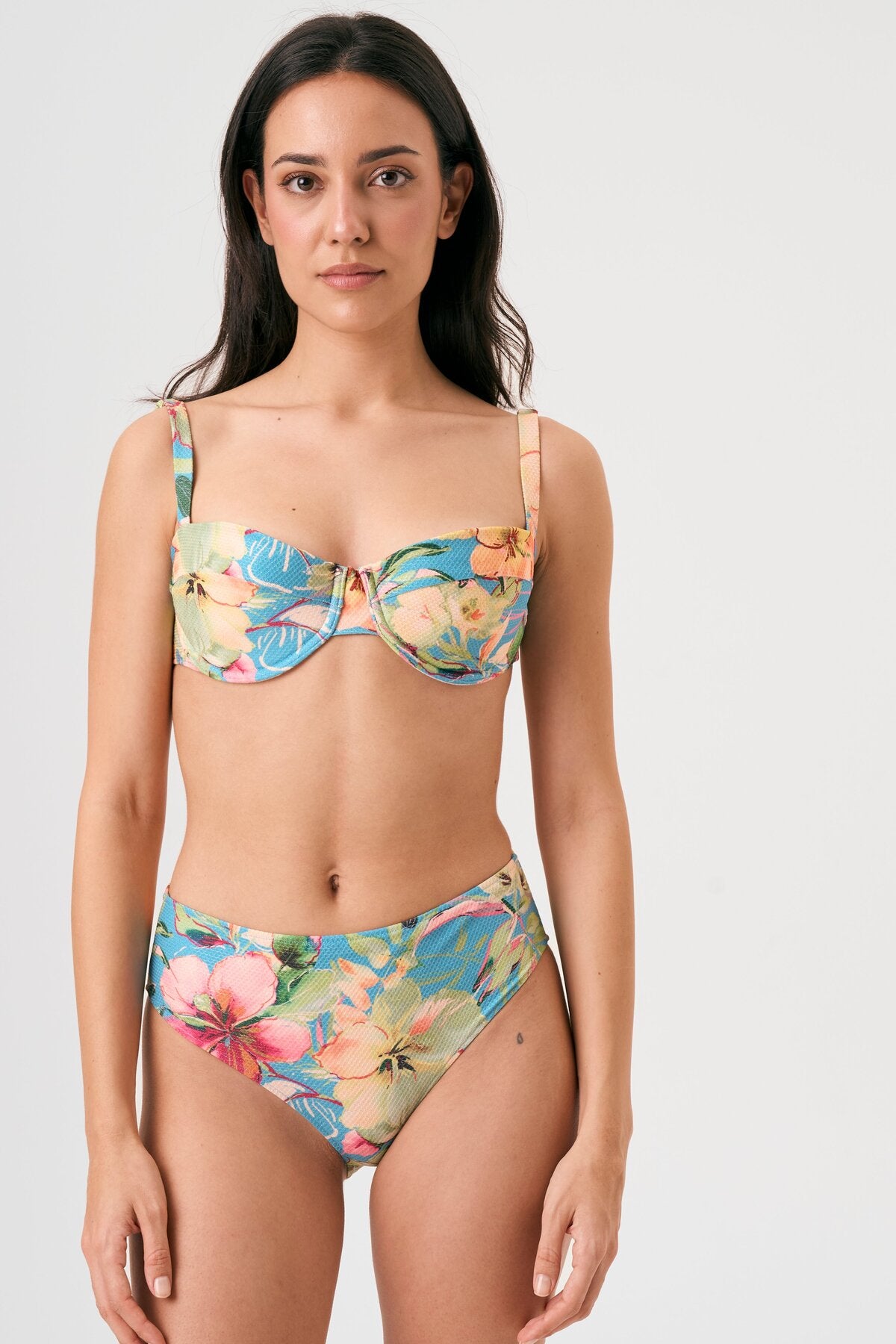 El bikini Bimba Aloa high está confeccionado con tejido de poliamida reciclada ECOWAVE® y estampación digital sostenible ZEROWATER. Incluye un top tipo balconette con aro, tirantes regulables y cierre de lazada en la espalda, y una braguita de tiro alto que estiliza la figura ofreciendo mayor cobertura. Ambos en un print original de Circu lleno de color con motivos florales en textura de piqué y acabado lúrex.