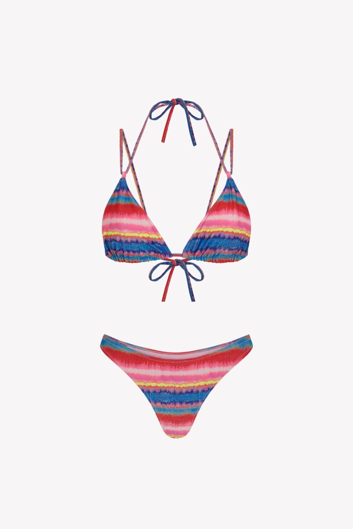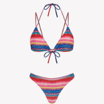 El bikini Lise Maca Samba está realizado en tejido de poliamida reciclada ECOWAVE® y estampación digital sostenible ZEROWATER. Compuesto por top triangular fruncido multiposición con posibilidad de anudar al cuello u hombros y braga tanga. Confeccionado en un print original de Circu a rayas horizontales lleno de color y en acabado lúrex.
