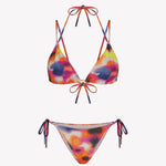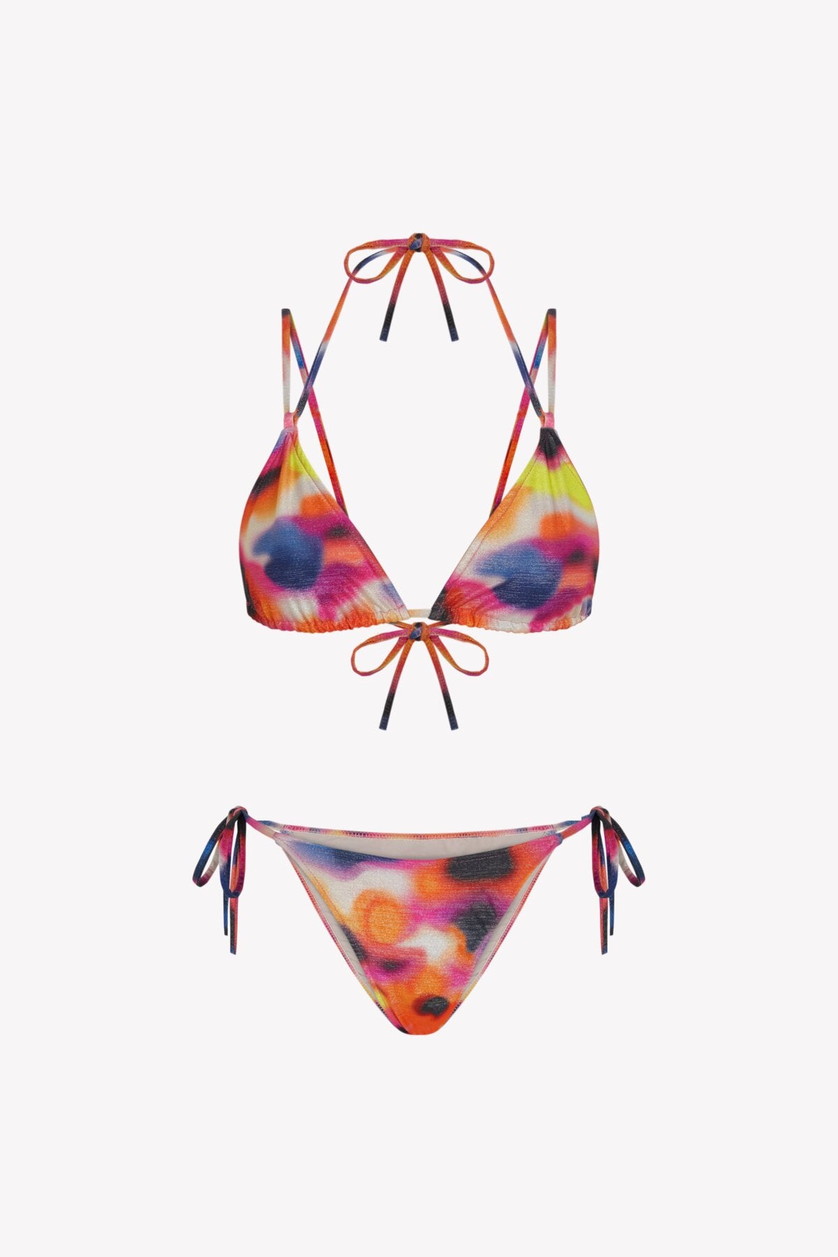 El bikini Lise Gara Calei está realizado en tejido de poliamida reciclada ECOWAVE® y estampación digital sostenible ZEROWATER. Compuesto por top triangular fruncido multiposición con posibilidad de anudar al cuello u hombros y braga normal con lazada. Confeccionado en un print original de Circu de formas órganicas acuareladas con efecto tie-dye, en acabado lúrex.