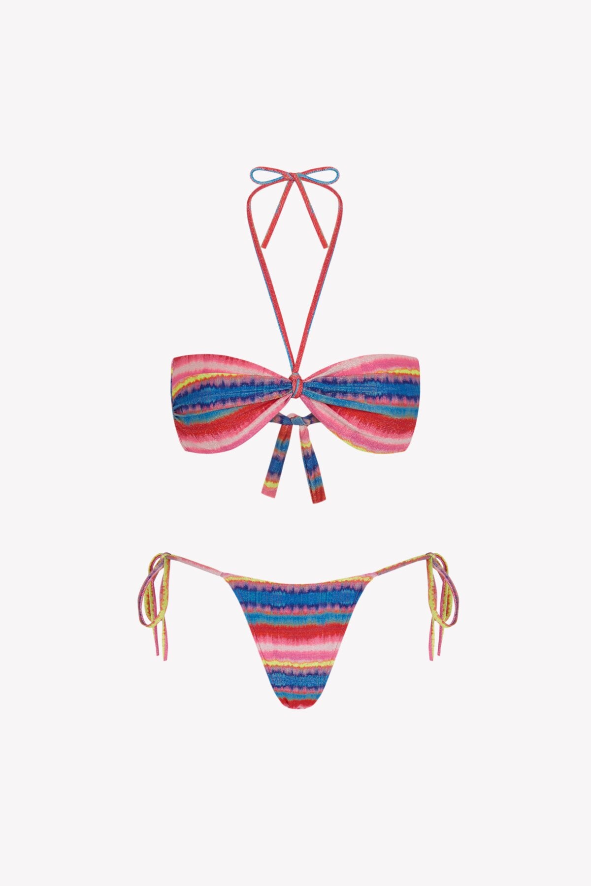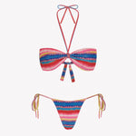 El bikini Maca Lise Samba está realizado en tejido de poliamida reciclada ECOWAVE® y estampación digital sostenible ZEROWATER. Compuesto por top bandeau fruncido con cinta multiposición con posibilidad de anudar al cuello o quitarla y braga tanga con lazadas. Confeccionado en un print original de Circu a rayas horizontales lleno de color y en acabado lúrex.