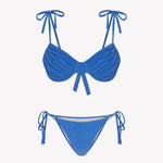 Bikini sostenible Gara Lise Positano de CIRCU. Top fruncido con aros y tirantes de lazada ajustable, braga tanga con lazadas. Tejido reciclado ECONYL® en azul cristalino con textura atoallada. Hecho éticamente en España.