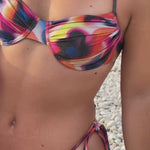 Bikini sostenible Gara Lise Calei. Top con aro y tirantes ajustables, braga tanga con lazadas. Tejido reciclado ECOWAVE® con estampado tie-dye y acabado lúrex. Hecho a mano en España.