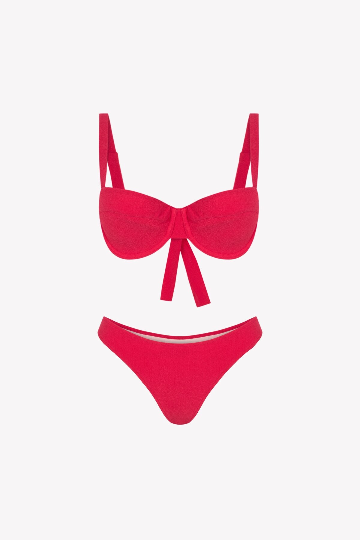 El bikini Bimba Mani Berry está confeccionado con tejido de poliamida reciclada ECONYL®. Compuesto por un top de tipo balconette con aro, tirantes regulables y cierre de lazada en la espalda, y braguita de corte brasileño. Ambos en color rojo cereza vibrante y tejido con original textura "atoallada".