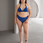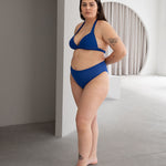 El bikini milos zafiro está confeccionado con tejido de poliamida reciclada ECONYL®, este conjunto está compuesto por una braga de cobertura medio con tiro alto y un sujetador de triángulo con lazada intercambiable y copas incorporadas. Ambos en color azul mediterráneo y tejido de toalla, suave y elástico.
